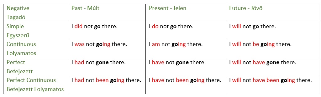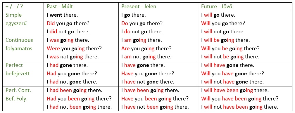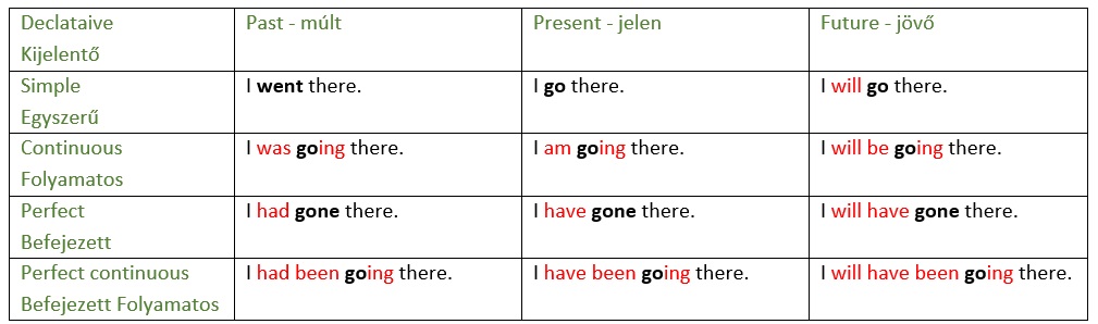 A fenti táblázatban ugyanaz a mondat van leírva mind a 12 igeidőben, kijelentő módban (tehát nem kérdő vagy tagadó). Pirossal a segédigéket jelöltem, illetve a tipikus "ing" végződést a folyamatos igeidőknél. A befejezett sorban azért nem jelöltem a "gone" szó végét, mert nem elég tipikus a "ne" végződés, csak néhány ige harmadik alakja "ne" végű.