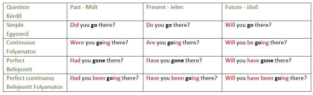 És most nézzük meg a 3 tábláztot egybevonva, egymás alatt látva az állító, tagadó és kérdő alakokat.