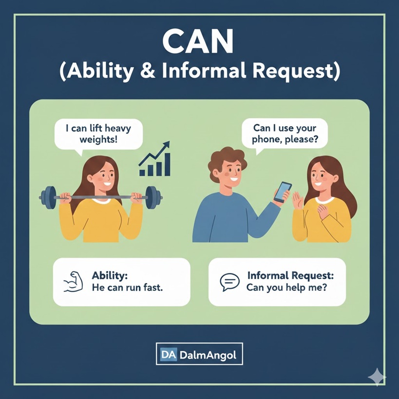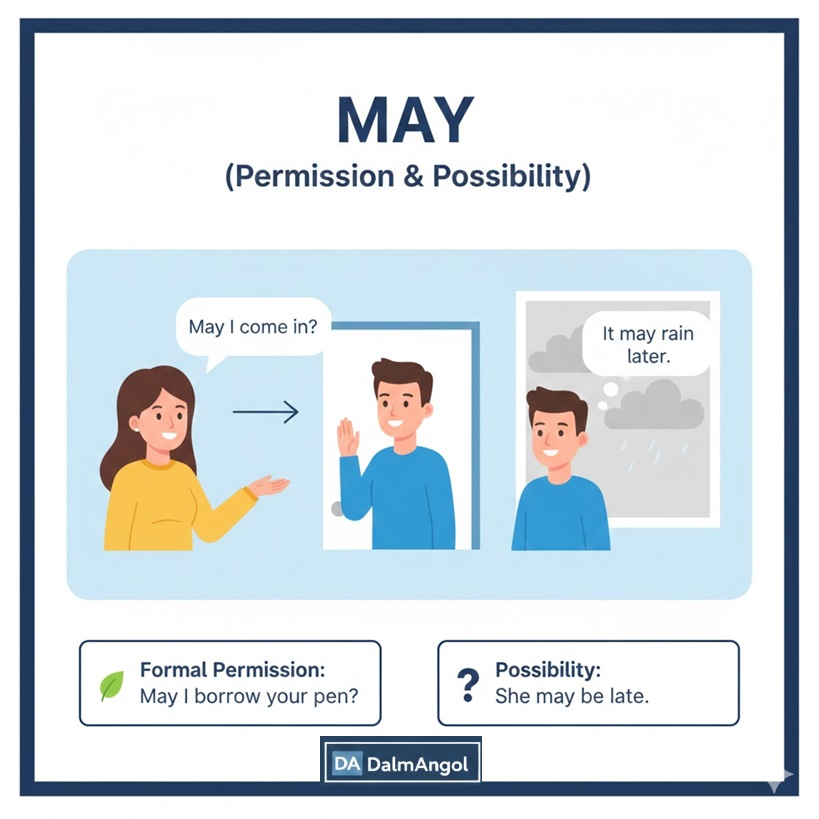 Az USA-ban voltam cserediák 16 éves koromban, és tisztán emlékszem arra, amikor az egyik tanáromtól megkérdeztem, hogy "Can I go to the bathroom?", erre ő azt mondta, hogy "Yes, you may.". Elmondta, hogy sokkal jobb, ha engedélyt a "may" szóval kérek, mert bár a "can"-nel is lehet, és a köznyelvben sok mindent lehet, azonban a választékos angolban az engedélykérésre a 'may' a helyes szó, míg a 'can' inkább a képességet fejezi ki (vagy a fizikai erőt, vagy a körülmények engedik-e).